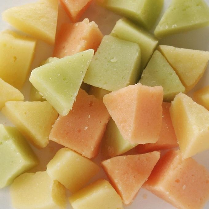 成分 奶酪、澱粉、小麥粉、明膠、植物油脂、蔬菜(西紅柿、菠菜)、甘油、礦物質(鈣)、丙二醇、增稠多醣、防腐劑(山梨酸鉀、脫氫乙酸鈉)、酸化劑、乳化劑、食用色素(β-胡蘿蔔素、氧化鈦、紅106、黃4、黃5、藍1)、抗氧化劑(異抗壞血酸鈉)、香料