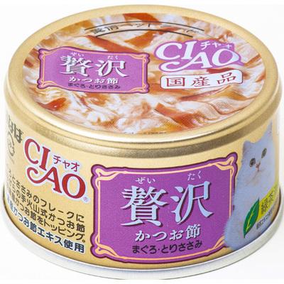 雞胸肉、吞拿魚、鰹魚提取物、鰹魚、糖(低聚醣等)、植物油、增稠劑(加工澱粉)、礦物質、調味料(氨基酸等)、增稠劑、維生素E、紅麴米色素、綠茶提取物、類胡蘿蔔素。