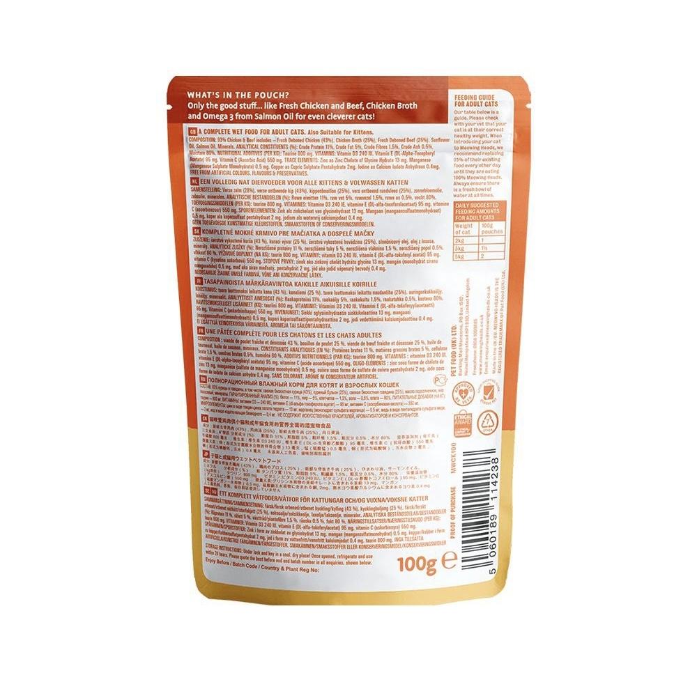 93%雞肉和牛肉包括–新鮮去骨雞(43%),雞湯(25%),新鮮去骨牛肉(25%),葵花籽油,鮭魚油,礦物質
