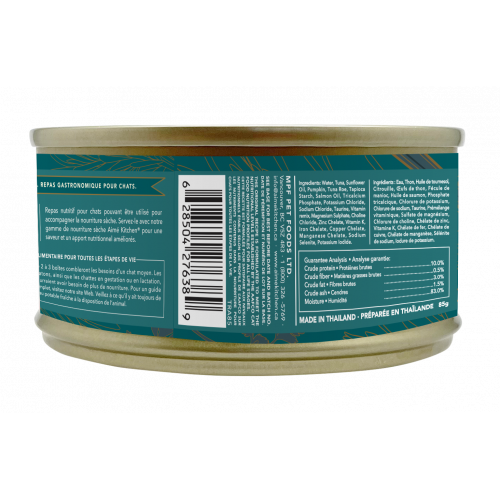 成分: 鮮吞拿魚、鮮吞拿魚子、葵花籽油、南瓜、木薯澱粉、鮮蝦、三文魚油、磷酸三鈣、氯化鉀、氯化鈉、牛磺酸、維生素預混料、硫酸鎂、氯化膽鹼、鋅螯合物、維生素K、鐵螯合物、銅螯合物、錳螯合物、亞硒酸鈉、碘化鉀。