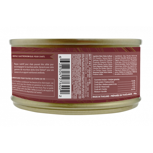 成分: 鮮雞肉、新鮮鯛魚肉、葵花籽油、南瓜、木薯澱粉、三文魚油、磷酸三鈣、氯化鉀、氯化鈉、牛磺酸、維生素預混料、硫酸鎂、氯化膽鹼、鋅螯合物、維生素K、鐵螯合物、銅螯合物、錳螯合物、亞硒酸鈉、碘化鉀。