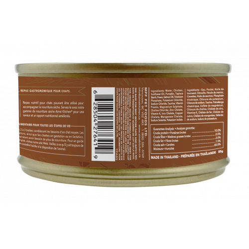 成分: 鮮雞肉、葵花籽油、南瓜、木薯澱粉、鮮蝦、三文魚油、磷酸三鈣、氯化鉀、氯化鈉、牛磺酸、維生素預混料、硫酸鎂、氯化膽鹼、鋅螯合物、維生素K、鐵螯合物、銅螯合物、錳螯合物、亞硒酸鈉、碘化鉀。