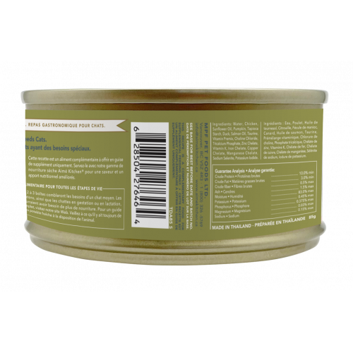 成分: 新鮮雞肉、葵花籽油、南瓜、木薯澱粉、鮮鴨肉、三文魚油、磷酸三鈣、氯化鉀、氯化鈉、牛磺酸、維生素預混料、硫酸鎂、氯化膽鹼、鋅螯合物、維生素K、鐵螯合物、銅螯合物、錳螯合物、亞硒酸鈉、碘化鉀。