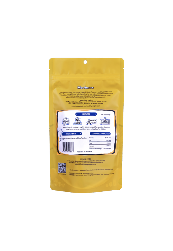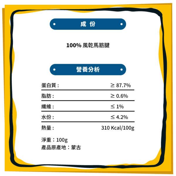 從毛孩需求出發,嚴選蒙古大地遊牧野馬筋,蘊藏優質骨膠原及天然葡萄糖胺,有助維護狗狗關節及毛髮健康。配合12-16cm切長,長度適中且美味耐咬,狗狗食用時滿足磨牙潔齒的需要。