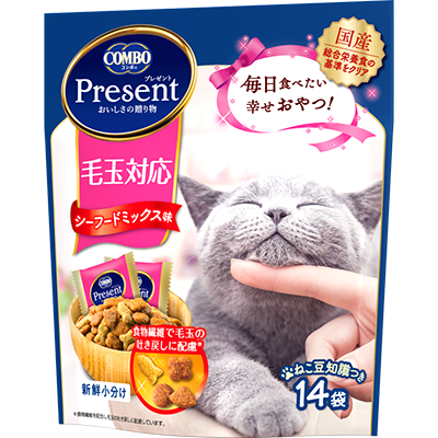 穀類(トウモロコシ、コーングルテンミール、小麦粉、パン粉)、肉類(チキンミール、牛肉粉、豚肉粉、チキンレバーパウダー)、油脂類(動物性油脂、植物性油脂)、魚介類(フィッシュミール、フィッシュパウダー、カニエキスパウダー、エビエキスパウダー、マグロエキス、カツオエキス、シラスパウダー)、脱脂大豆、オリゴ糖、ミネラル類(カルシウム、リン、カリウム、ナトリウム、クロライド、銅、亜鉛、ヨウ素)、pH調整剤、アミノ酸類(タウリン、トリプトファン、メチオニン)、ビタミン類(A、B1、B2、B6、B12、D、E、K、ニコチン酸、パントテン酸、葉酸、コリン)、酵母細胞壁(食物繊維源)、着色料(二酸化チタン、食用赤色102号、食用赤色106号、食用黄色5号)、調味料、酸化防止剤(ミックストコフェロール、ローズマリー抽出物)