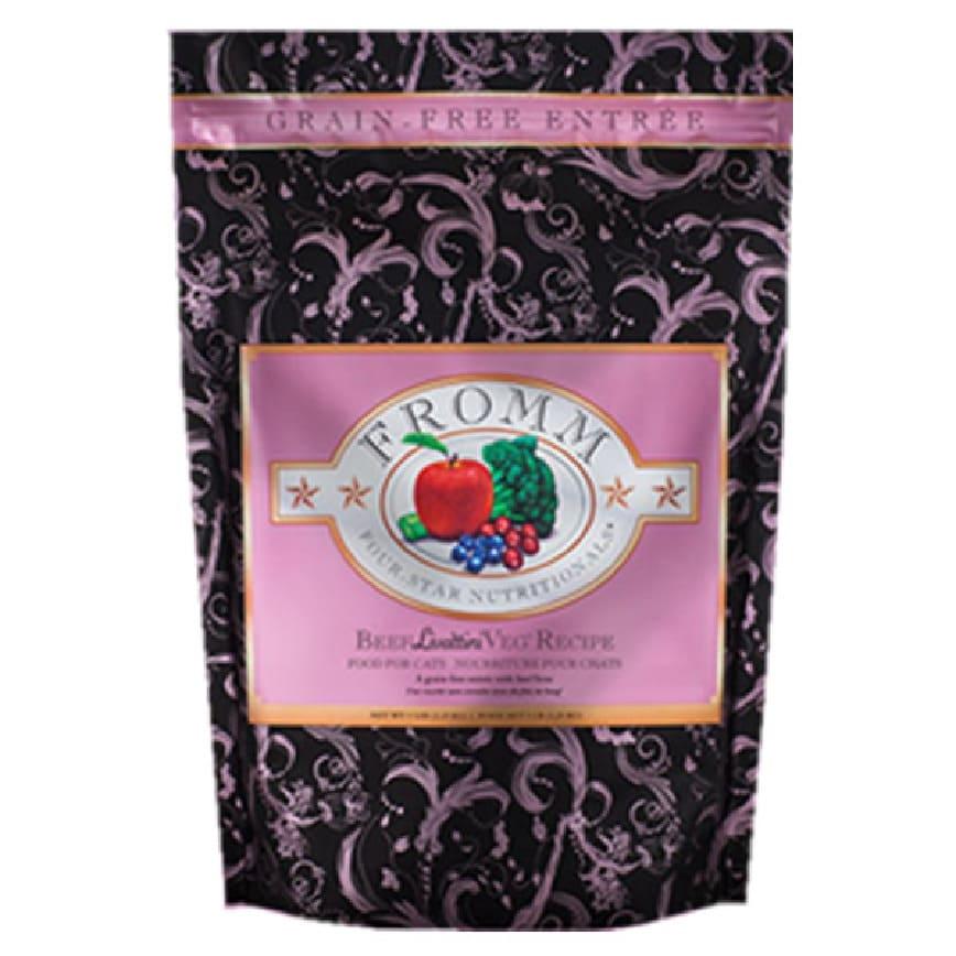 Fromm 無穀物牛肝牛肉蔬果配方 貓糧,選用優質牛肉,所含鐵質較其他肉類高,容易被身體吸收,還包含多種礦物質和維生素,是身體必需營養素,加上有多種新鮮蔬菜水果,有抗氧化功效又能夠幫助腸道內的毛髮自然排出,添加牛磺酸和絲蘭萃取物,保護尿道健康。