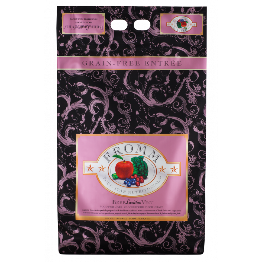 Fromm 無穀物牛肝牛肉蔬果配方 貓糧,選用優質牛肉,所含鐵質較其他肉類高,容易被身體吸收,還包含多種礦物質和維生素,是身體必需營養素,加上有多種新鮮蔬菜水果,有抗氧化功效又能夠幫助腸道內的毛髮自然排出,添加牛磺酸和絲蘭萃取物,保護尿道健康。