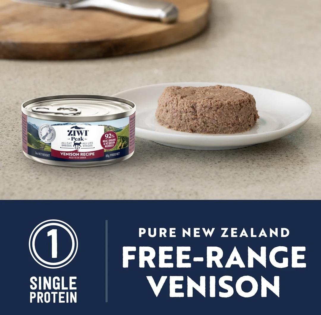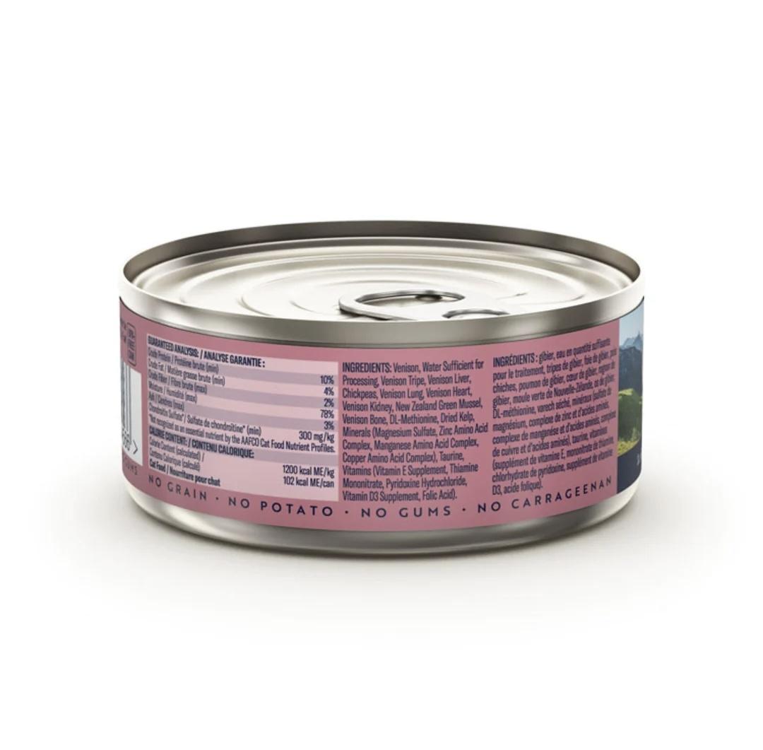 鹿肉,水,鹿草胃,鹿肝,鷹嘴豆,鹿肺,鹿心, 鹿腎, 新西蘭綠唇貽貝,鹿骨,DL-蛋氨酸,海帶 乾,礦物質,牛磺酸,維他命