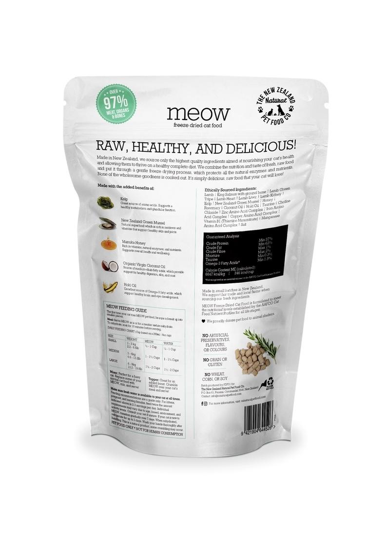 MEOW is made using only the highest quality ingredients aimed at nourishing your pet's health. We combine the nutrition and taste of fresh, raw food and put it through a gentle freeze drying process which protects all the natural enzymes and nutrients, so none of the wholesome goodness is cooked out.