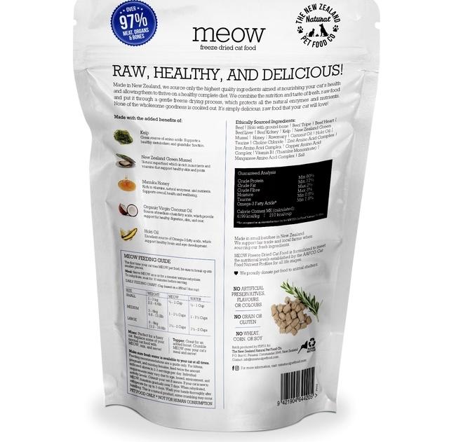 MEOW is made using only the highest quality ingredients aimed at nourishing your pet's health. We combine the nutrition and taste of fresh, raw food and put it through a gentle freeze drying process which protects all the natural enzymes and nutrients, so none of the wholesome goodness is cooked out.