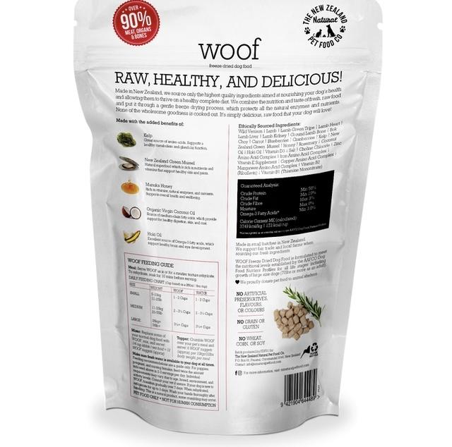 WOOF is made using only the highest quality ingredients aimed at nourishing your pet's health. We combine the nutrition and taste of fresh, raw food and put it through a gentle freeze drying process which protects all the natural enzymes and nutrients, so none of the wholesome goodness is cooked out.