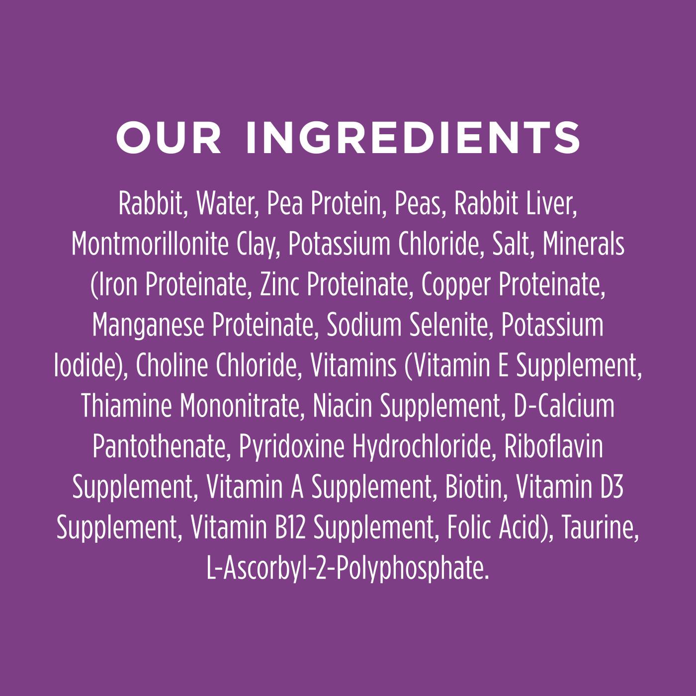 Rabbit, Water, Pea Protein, Peas, Rabbit Liver, Montmorillonite Clay, Potassium Chloride, Salt, Minerals (Iron Proteinate, Zinc Proteinate, Copper Proteinate, Manganese Proteinate, Sodium Selenite, Potassium Iodide), Choline Chloride, Vitamins (Vitamin E Supplement, Thiamine Mononitrate, Niacin Supplement, D-Calcium Pantothenate, Pyridoxine Hydrochloride, Riboflavin Supplement, Vitamin A Supplement, Biotin, Vitamin D3 Supplement, Vitamin B12 Supplement, Folic Acid), Taurine, L-Ascorbyl-2-Polyphosphate.