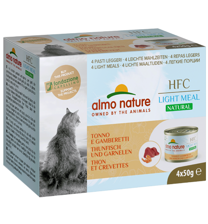 HFC Light Meal 50g 是每次 70g 份量“太多”時提供給貓的“迷你餐”,會被浪費。所有原本適合人類食用的 HFC 成分的質量,現在也為“小貓”創造了食物。 “食客”,對於要求最苛刻的人,他們喜歡白天各種口味,但也適合那些獸醫要求必須少吃的人。HFC Light 系列的 Almo Nature 想要選擇 6 種您的貓最喜歡的食譜,並以一種簡化的格式。方便的 4 個 50 克罐裝包裝。