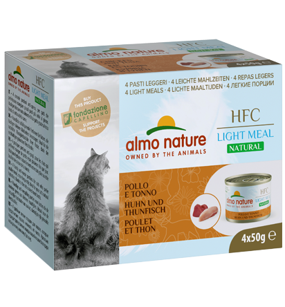 HFC Light Meal 50g 是每次 70g 份量“太多”時提供給貓的“迷你餐”,會被浪費。所有原本適合人類食用的 HFC 成分的質量,現在也為“小貓”創造了食物。 “食客”,對於要求最苛刻的人,他們喜歡白天各種口味,但也適合那些獸醫要求必須少吃的人。HFC Light 系列的 Almo Nature 想要選擇 6 種您的貓最喜歡的食譜,並以一種簡化的格式。方便的 4 個 50 克罐裝包裝。