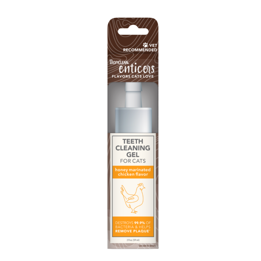 產品簡介: 向您的愛寵的美食問好。 TropiClean Enticers 牙齒清潔凝膠是一種肉味口腔護理潔齒液,帶有肉類的香氣,會讓您的愛寵愛上清潔牙齒。而且由天然成分製成,經證明可消滅口腔中 99.9% 的有害細菌——有助於去除牙菌斑並減少口臭。