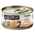Tuna, water sufficient for processing, Prawns, Tapioca Starch, Sunflower Seed Oil, Tricalcium Phosphate, Xanthan Gum, Choline Chloride, Taurine, Fructooligosaccharide, Zinc Sulfate, Vitamin E Supplement, Thiamine Mononitrate, Nicotinic Acid, Calcium Pantothenate, Manganese Sulfate, Vitamin A Supplement, Ferrous Sulfate, Copper Sulfate, Riboflavin Supplement, Pyridoxine Hydrochoride, Folic Acid, Potassium Iodide, Menadione Sodium Bisulfate Complex, Vitamin B12 Supplement