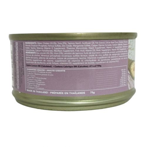 Water, Chicken, Tuna, Tapioca Starch, Sunflower Oil, Fish Extract, Locust Bean Gum, Choline Chloride, Vitamins and Minerals, Taurine.