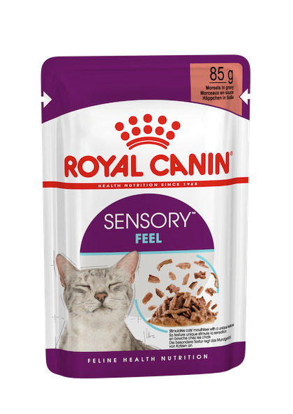 不同質地的食物所帶來的口感,會直接影響貓咪的用餐體驗。所謂的口感,來自進食過程中,口腔所感受到的各種觸感刺激:從咬下第一口,繼而咀嚼,至最後吞嚥,食物在嘴裡產生的物理和化學作用均涉及其中。換句話說,對於貓來說,進食除了關乎味覺,更多是觸覺的體驗。Royal Canin 的 SENSORY™ FEEL 口感配方著意提升食物的口感,以進一步刺激貓咪的感官,同時為進食帶來與別不同的驚喜體驗。配方採用獨特的肉汁與啫喱狀質地炮製而成,外層更為嫩滑,令口感更濃厚豐富,可在貓咪的嘴裡停留更長時間。這種煙韌彈牙的肉塊口感,對貓咪極具吸引力,為貓糧賦予不同的口感變化。