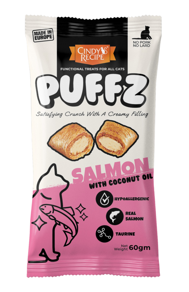 Cindy’s Recipe@Puffz功能性貓零食具有雙重質地的酥脆外皮和令人驚嘆的柔軟奶油狀中心 ; 僅採用最優質的成分製成,含有椰子油、纖維、維生素 D3 和低聚果糖-每種成分均專為解決貓的常見問題(如毛球、牙齦疾病、皮膚或腸道敏感),而設計非常適合玩耍和作為貓的獎勵。