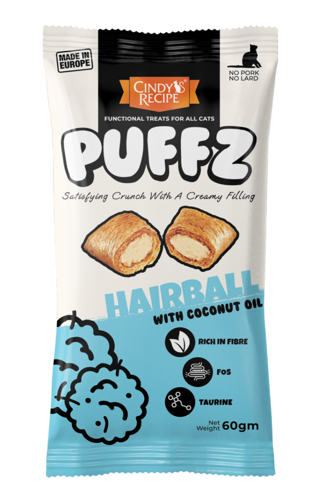 Cindy’s Recipe@Puffz功能性貓零食具有雙重質地的酥脆外皮和令人驚嘆的柔軟奶油狀中心 ; 僅採用最優質的成分製成,含有椰子油、纖維、維生素 D3 和低聚果糖-每種成分均專為解決貓的常見問題(如毛球、牙齦疾病、皮膚或腸道敏感),而設計非常適合玩耍和作為貓的獎勵。
