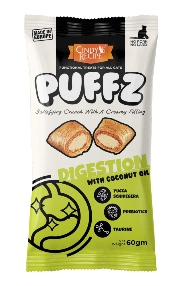 Cindy’s Recipe@Puffz功能性貓零食具有雙重質地的酥脆外皮和令人驚嘆的柔軟奶油狀中心 ; 僅採用最優質的成分製成,含有椰子油、纖維、維生素 D3 和低聚果糖-每種成分均專為解決貓的常見問題(如毛球、牙齦疾病、皮膚或腸道敏感),而設計非常適合玩耍和作為貓的獎勵。
