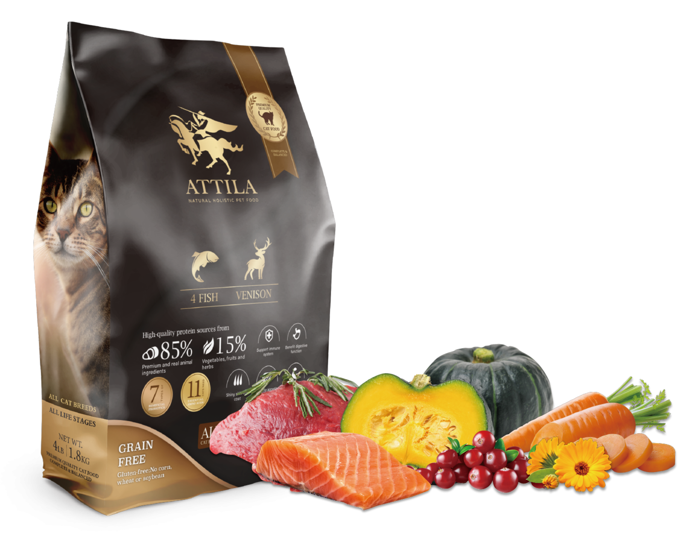 乾燥鯡魚(25%)、乾燥鮭魚(22%)、乾燥比目魚(16%)、乾燥藍鱈(15%)、脫水鹿肉(5%)、甜菜、乾燥苜蓿、南瓜、紅蘿蔔、整粒蔓越莓、乾燥研磨鱉蛋粉、整塊原型牛肝凍乾研磨(1%)、噴霧乾燥雞肝(1%)、雞肉脂肪 (維生素E保存)、鮭魚油 (DHA與EPA來源)、蛋胺酸、牛磺酸、蝦紅素、絲蘭、葡萄糖胺、酵母硒、金盞花、黑芝麻、芹菜籽