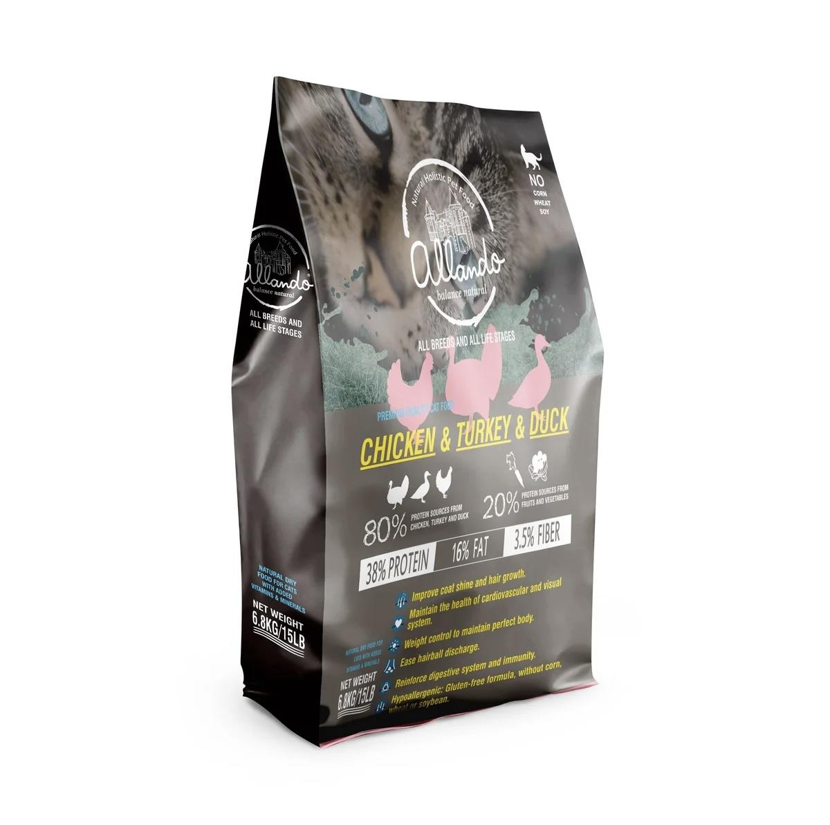 脫水雞肉、火雞肉、鴨肉茸、曬乾苜蓿、雞肉脂肪(與維生素E混合)、雞肝、整粒低溫烘焙亞麻籽、鷹嘴豆、胡蘿蔔、甜菜、蔓越莓、蘋果、南瓜、地瓜、酵母水解物、多種維生素(維生素A、B1、B2、B3、B5、B6、B9、B12、D3、E、C、生物素)、牛磺酸、多種礦物質(鐵、銅、鋅、錳、硒)、絲蘭、酵母硒