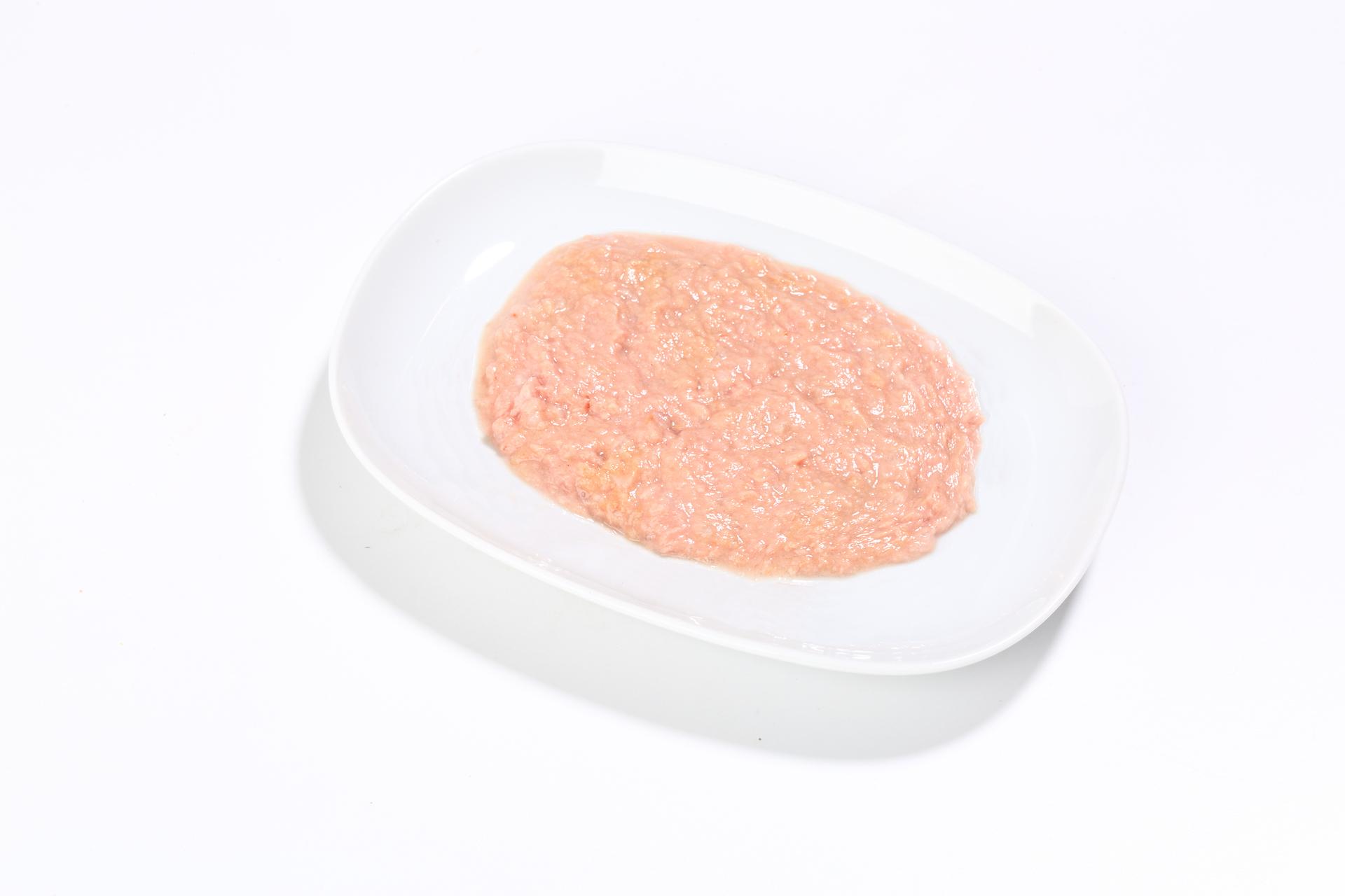 Tuna 56%, fish broth 37,2%, shrimps 4%, rice 1,5%, tapioca starch, dried egg products.