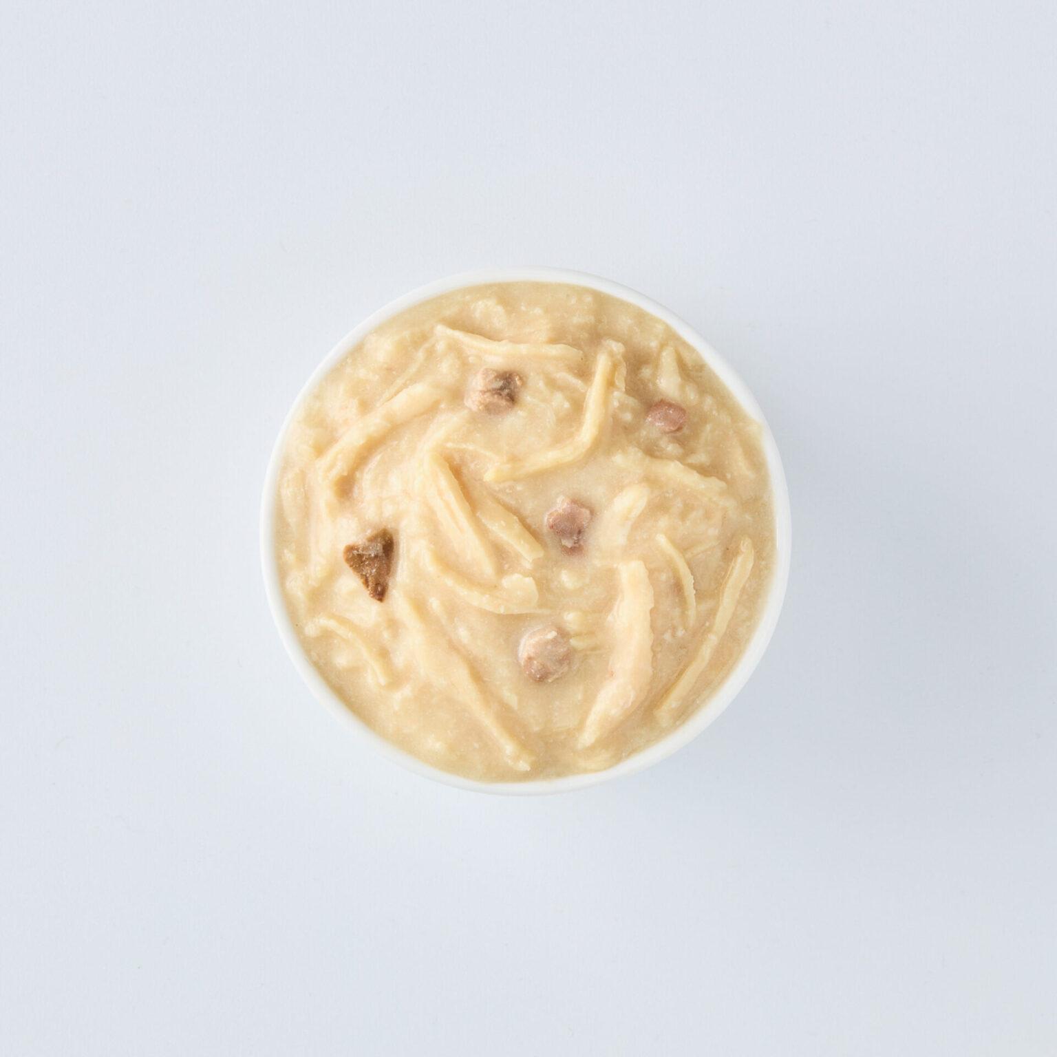 成份 雞肉、雞內臟(胗、肝、心)、雞湯、吞拿魚 、改性木薯澱粉、黃原膠、維生素、礦物質、椰子油(MCT)、葵花油、低聚果糖、牛磺酸、磷蝦油 營養分析 粗蛋白質11%以上、粗脂肪5.5%以上、粗纖維1%以下、水分最多76%以下 其他營養 鈣0.6%、磷0.3%、鉀0.3%、鈉0.1%、氯化物0.2%、鎂0.04%、DHA0.02% 熱量 101 Kcal/100g 每日建議份量/包 0.5-1Kg/ 1-2 1-2Kg / 2-3 2-4Kg /3-5