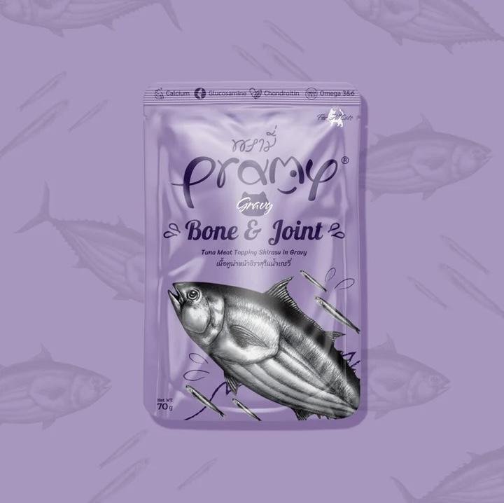 吞拿⿂、銀魚、改性木薯澱粉、維生素、礦物質、低聚果糖(FOS)、絲蘭、酵母萃取物、氯化膽鹼、膠原蛋白、牛磺酸、磷蝦油、葡萄糖胺、硫酸軟骨素、維生素E、椰子油(MCT) 34.8Kcal/ 100g made in ThailandPramy 功能性貓濕包[肉汁系列] -70g