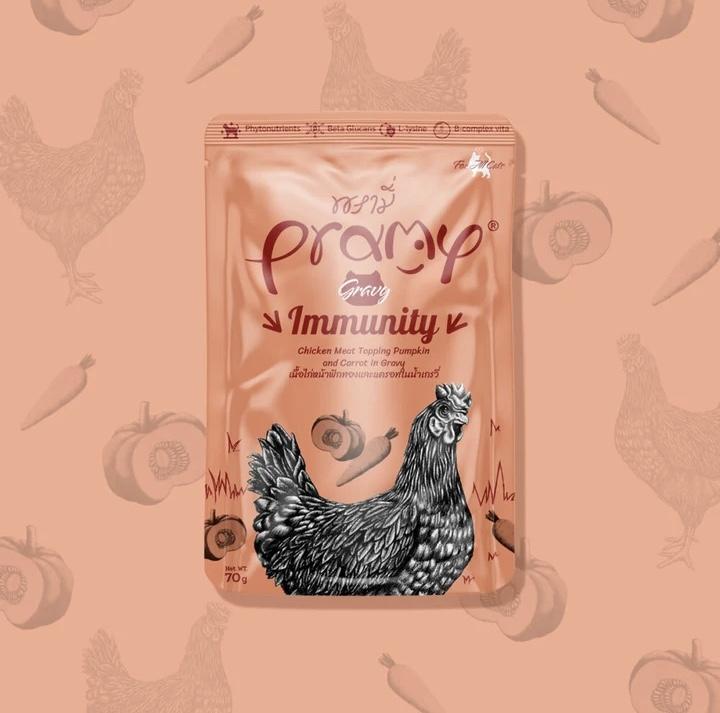 雞肉、南瓜、胡蘿蔔、改性木薯澱粉、維生素、礦物質、低聚果糖(FOS)、絲蘭、酵母萃取物、複合維生素B、氯化膽鹼、牛磺酸、磷蝦油、L-離胺酸、維生素E、椰子油(MCT) 34.8Kcal/ 100g made in ThailandPramy 功能性貓濕包[肉汁系列] -70g