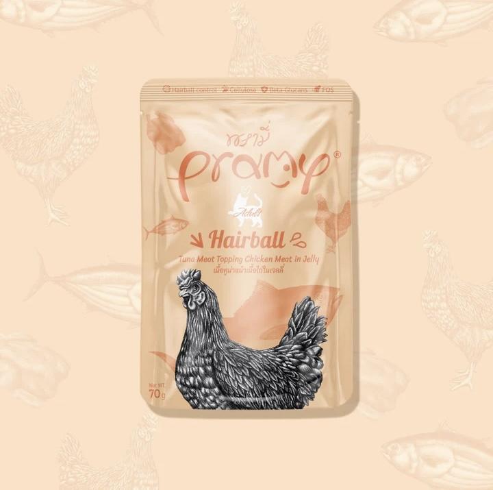 吞拿魚、雞肉、改性木薯澱粉、天然香料、纖維素纖維、亞麻籽油、果凍粉、牛磺酸、維生素E、低聚果糖(FOS)、酵母萃取物、月見草油 33.55Kcal/ 100g made in ThailandPramy 功能性貓濕包[啫喱系列] -70g
