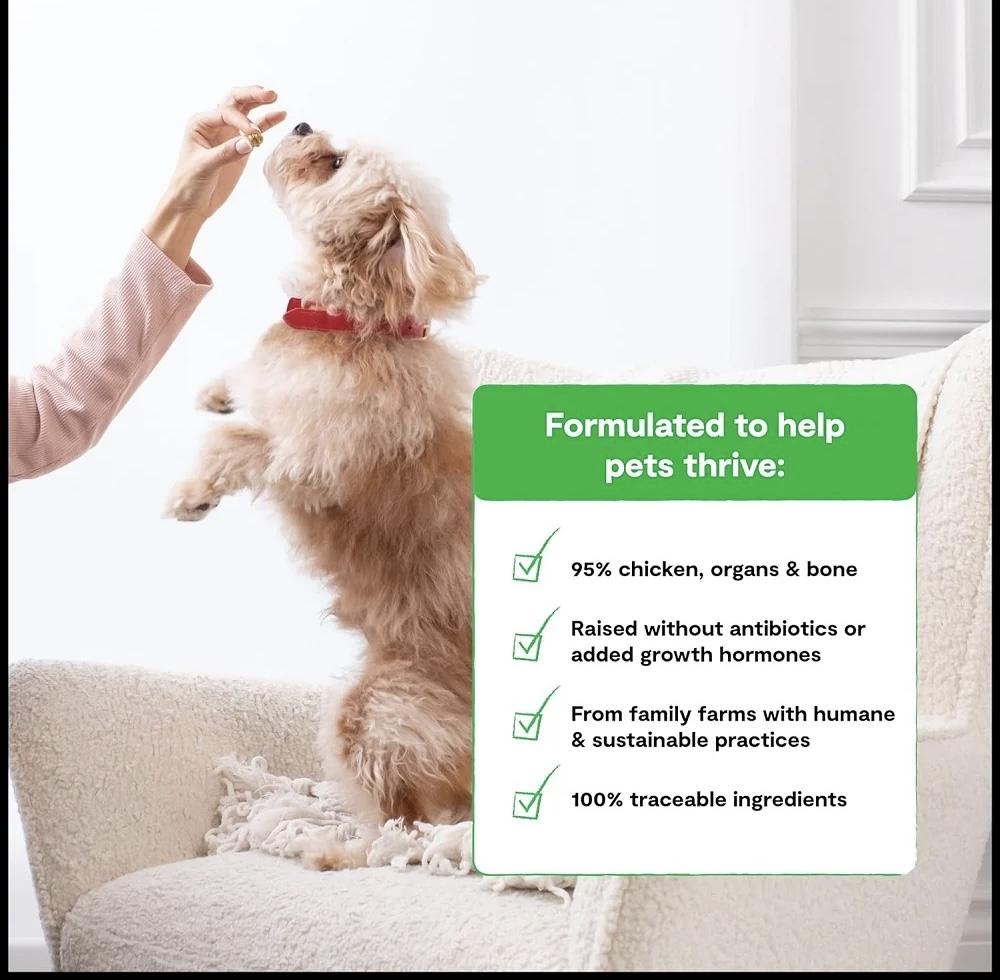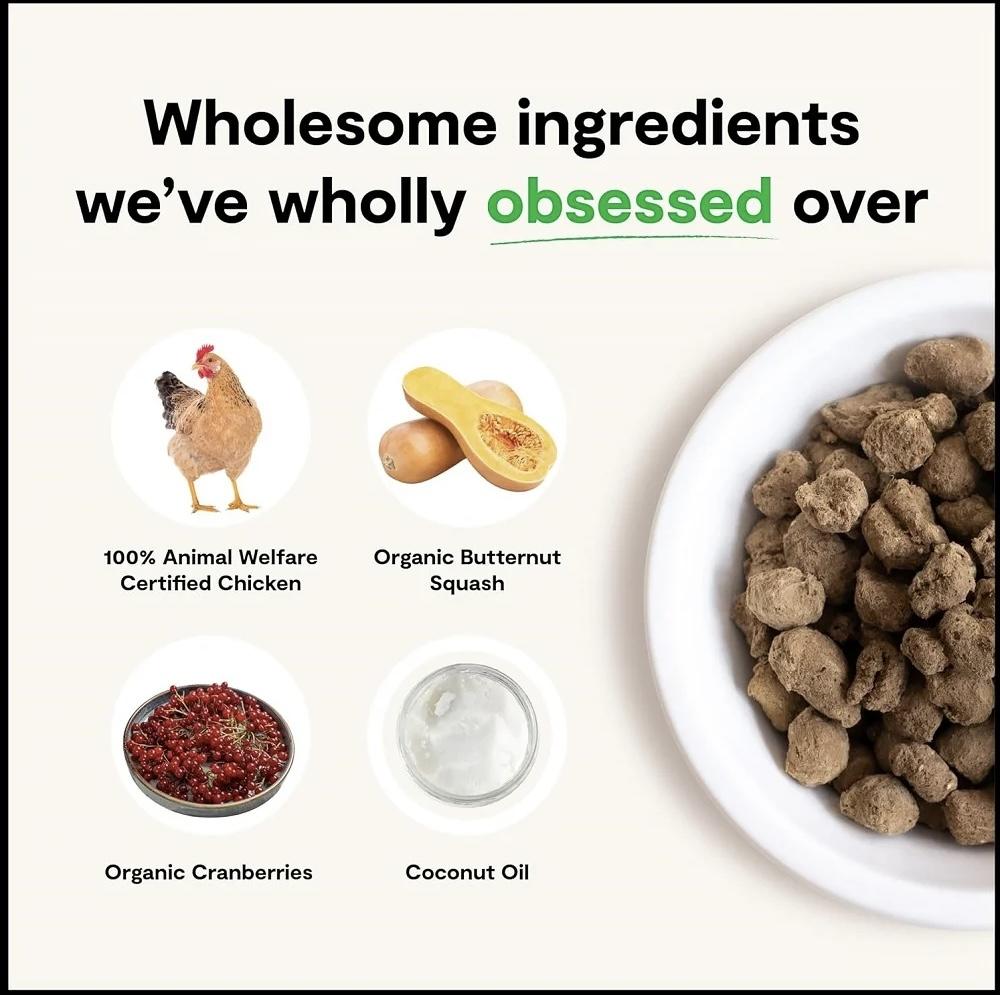 雞骨,雞肝,雞頸,有機胡桃南瓜,有機胡蘿蔔,有機蔓越莓,有機藍莓,蒙脫土,椰子油,氯化鉀,鹽,氯化膽鹼,乾菊苣根,維生素(維生素E補充劑,維生素A補充劑、菸鹼酸補充劑、泛酸、核黃素補充劑、維生素D3 補充劑、單硝酸硫胺、維生素B12 補充劑、鹽酸吡哆醇、葉酸)、有機菠菜、有機蘋果醋、有機羽衣甘藍、礦物質(蛋白質鋅、蛋白質鐵、蛋白質銅) 、蛋白錳、酵母硒、碘酸鈣)、鮭魚油、乾海帶、混合生育酚(防腐劑)、硫酸鎂、有機南瓜籽、有機葵花籽、肉桂、薑黃、迷迭香萃取物。
