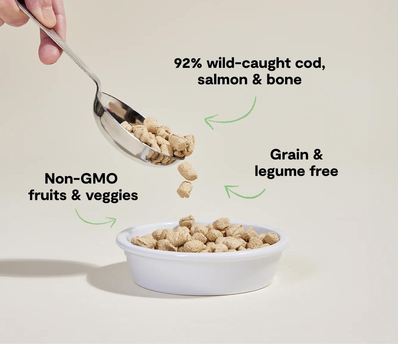 我們的三文魚和鱈魚配方含有特別調配的 92% 野生海捕三文魚和太平洋海捕鱈魚,是貓咪無法抗拒的真正獵物模式飲食。