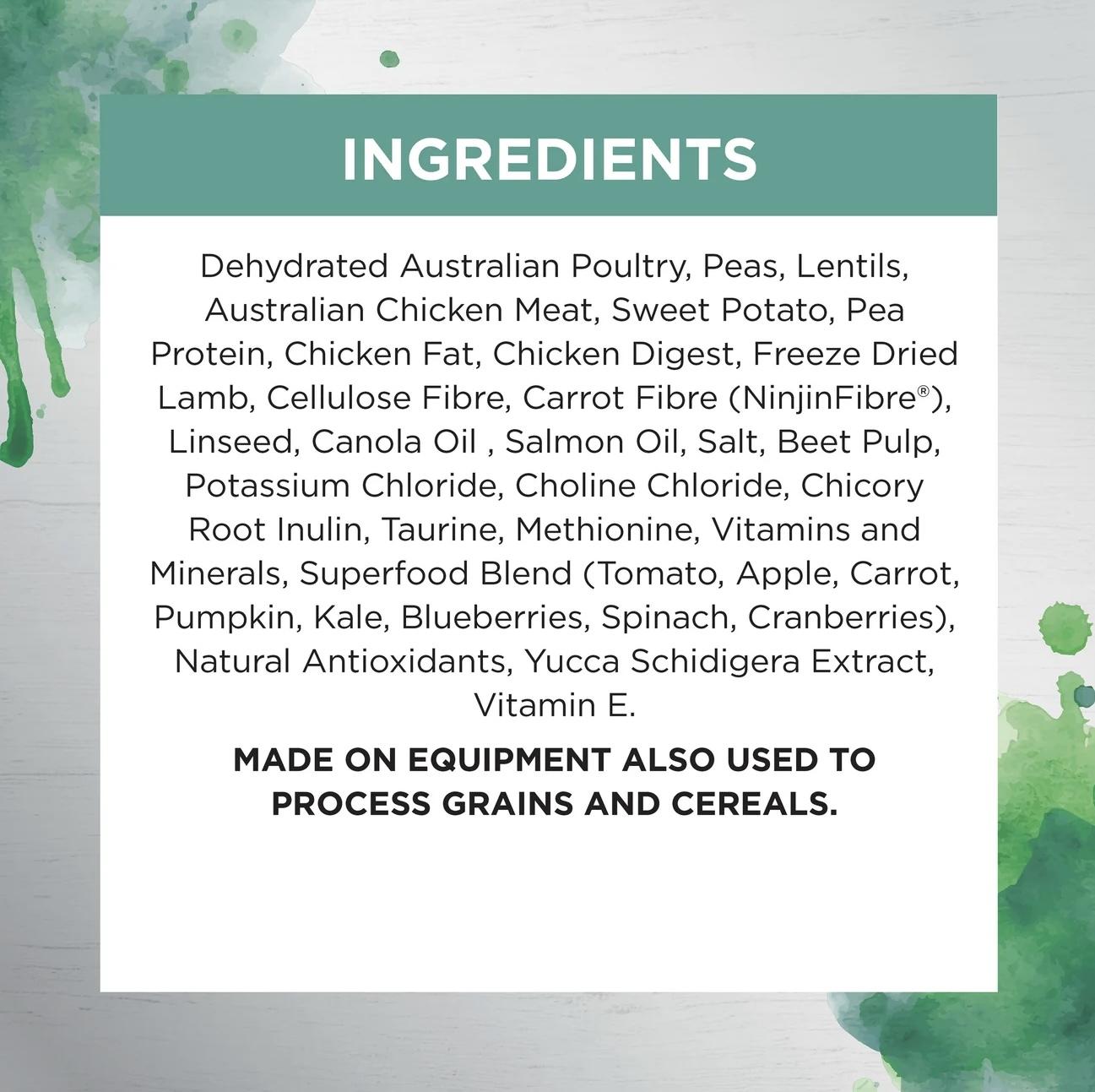 脫水澳洲家禽、豌豆、扁豆、澳洲雞肉、地瓜、豌豆蛋白、雞脂肪、雞消化物、冷凍乾燥羊肉、纖維素纖維、胡蘿蔔纖維(NinjinFibre®)、亞麻籽、菜籽油、鮭魚油、鹽、甜菜漿、氯化鉀、氯化膽鹼、菊苣根菊粉、牛磺酸、蛋氨酸、維生素和礦物質、超級食物混合物(番茄、蘋果、胡蘿蔔、南瓜、羽衣甘藍、藍莓、菠菜、蔓越莓)、天然抗氧化劑、絲蘭萃取物、維生素E。