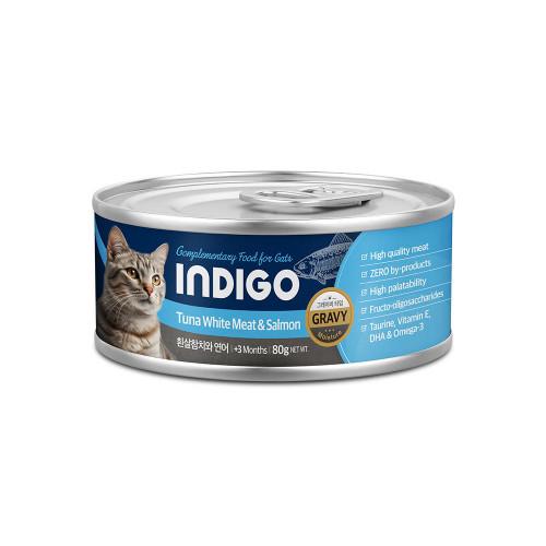 [Indigo-貓罐]韓國5星益生元主食罐|吞拿魚+三文魚|保護血管|(湯汁肉絲/主食)|80g