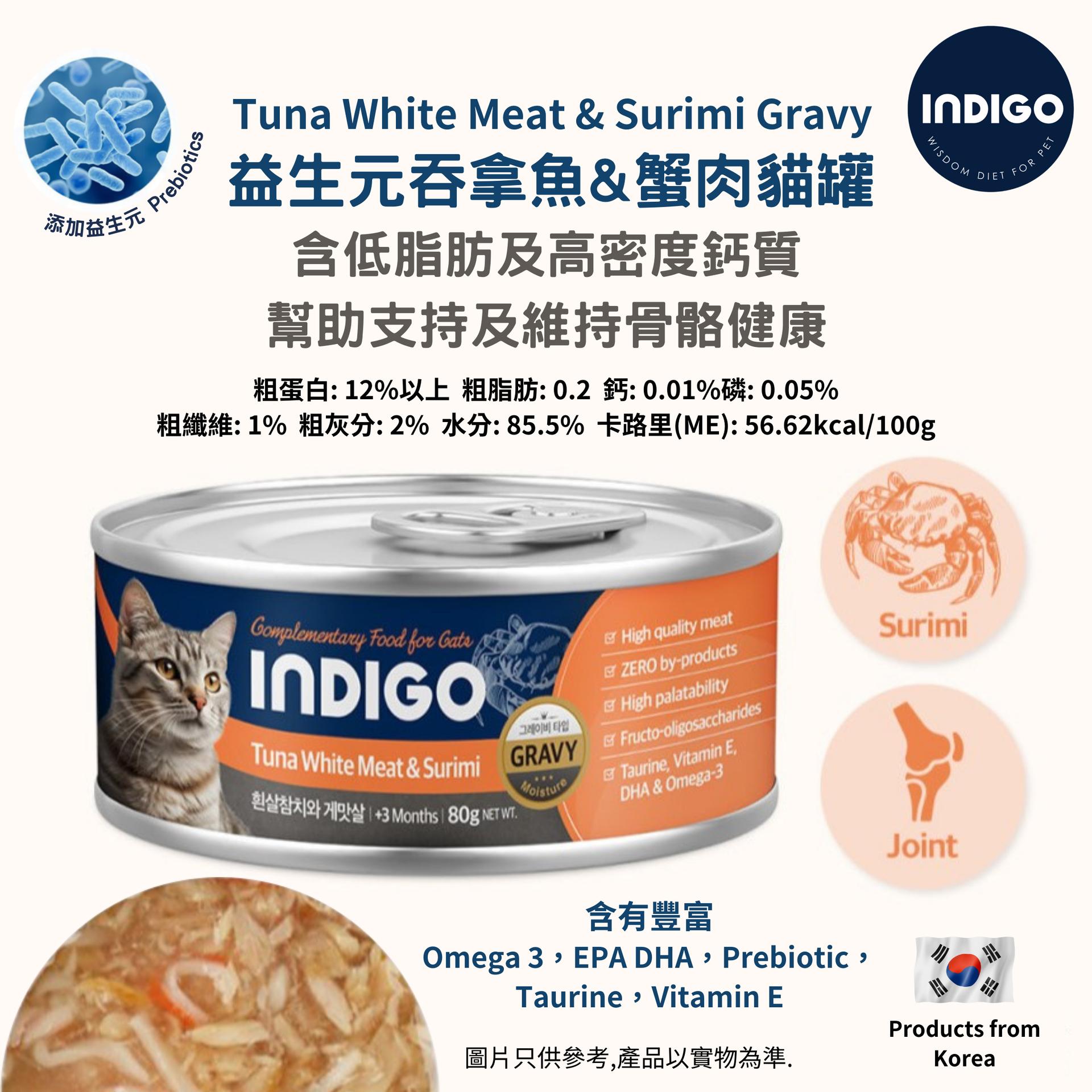 [Indigo-貓罐]韓國5星益生元主食罐|吞拿魚+蟹肉|保護關節|(湯汁肉絲/主食)|80g