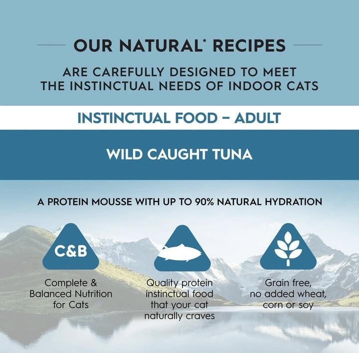 本產品嚴選野生捕撈吞拿魚為主要蛋白來源,富含天然營養,完美呼應貓咪天生肉食者的本能飲食需求,即使是住在室內的貓咪,也能透過這份自然純粹的美食與自然連結。