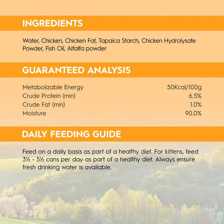 水、雞肉、增稠劑、雞脂肪、雞肉水解粉、魚油、磷酸三鈣、苜蓿粉、礦物質、氯化鈉、氯化膽鹼、牛磺酸、維生素、硫酸鎂,氯化鉀、碘化鉀