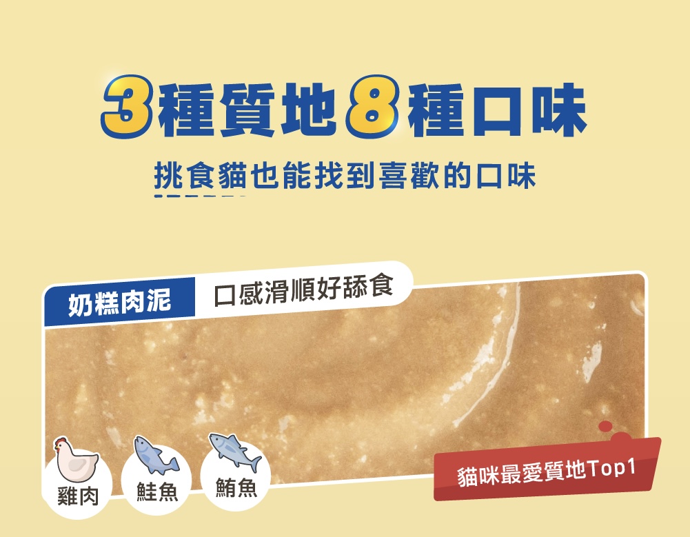 ▸選擇豐富:2種質地5種口味,挑食貓也能找到愛吃的