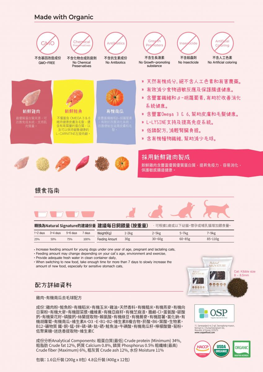 [Natural Signature]天然有機貓糧|雞肉、有機南瓜去毛球配方|Chicken Pumpkin Formula|1.6KG (200克X8獨立包裝)|韓國製