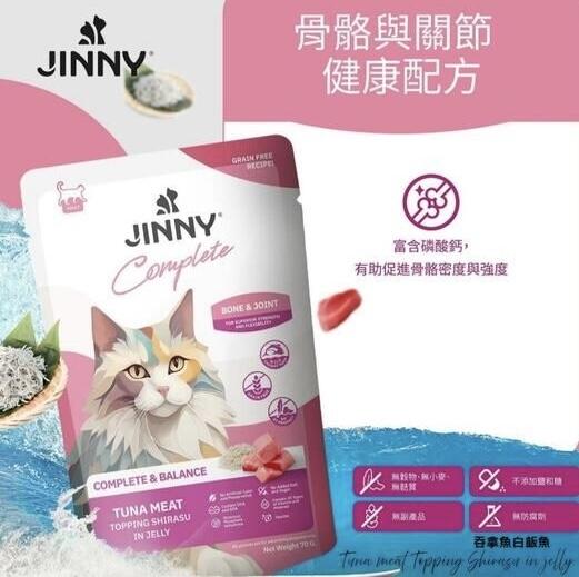 [Jinny Complete]無穀物營養主食餐包(貓)|成貓|吞拿魚+白飯魚|保護關節及骨骼|70g|(啫喱肉絲)