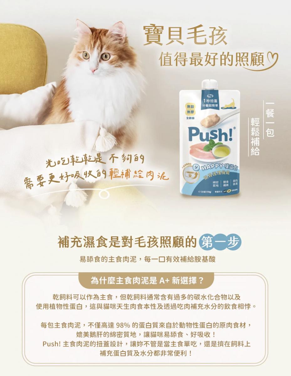 當然可以!全系列 Push! 主食肉泥根據國際寵物食品安全與營養規範打造黃金比例營養,不僅能提供優質的蛋白質來源,還能幫助補充貓咪每日所需的飲水量。