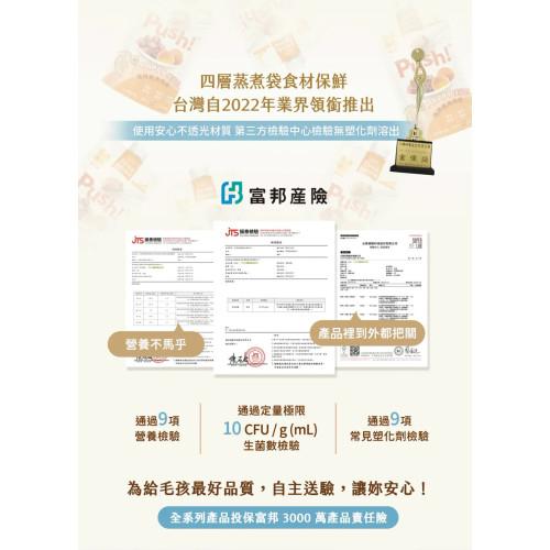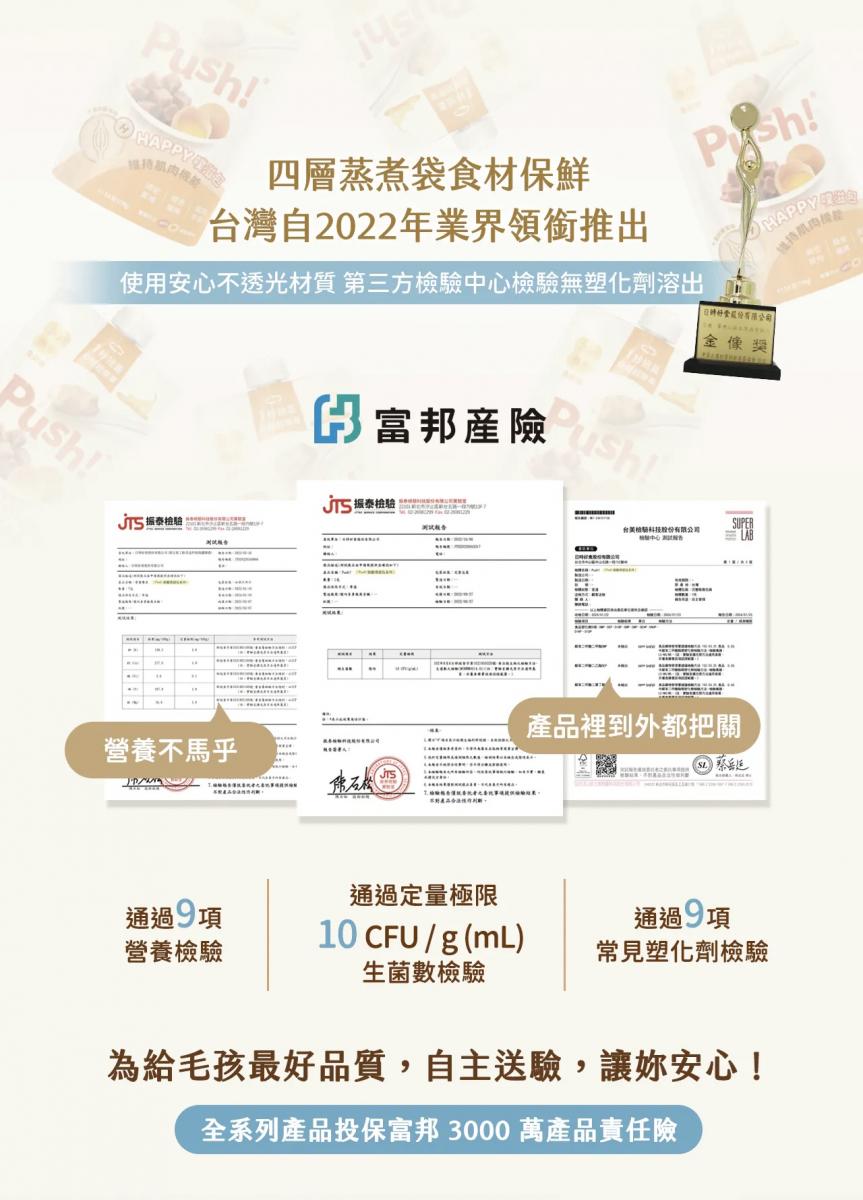 由於 Push! 主食肉泥的食材選用來自不同季節或批次,可能導致成品在色澤和含水量上有些微差異。Push! 堅持不添加色素修飾校正,確保食品安全,同時全系列產品已投保富邦 3000 萬產品責任險,讓毛爸媽更安心。