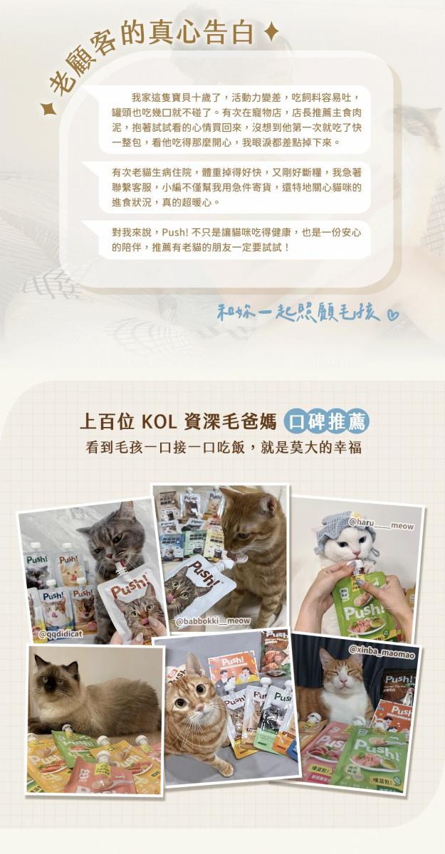 開始進食固態食物的離乳幼貓即可餵食 Push! 主食肉泥,其綿密適口的質地特別適合挑嘴或進食能力較弱的幼貓。此外,牙口不佳的高齡貓(銀髮貓)也能輕鬆食用。對於腎臟疾病的貓咪,由於需注意蛋白質與鈣磷比例,建議根據獸醫師提供的專業意見進一步調整餵食方案。