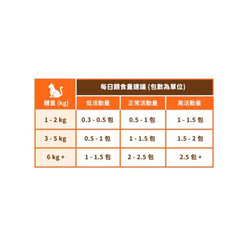 一般而言,成貓每公斤體重每日需要 45~80 KCal 的熱量。不過實際餵食量需視每隻貓咪的年齡、活動量以及進食習慣調整,以下是建議的粗略參考餵食量。
