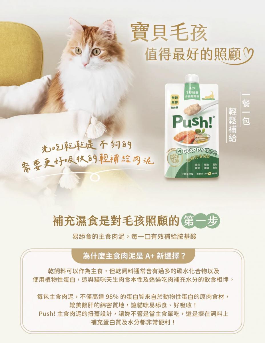 當然可以!全系列 Push! 主食肉泥根據國際寵物食品安全與營養規範打造黃金比例營養,不僅能提供優質的蛋白質來源,還能幫助補充貓咪每日所需的飲水量。