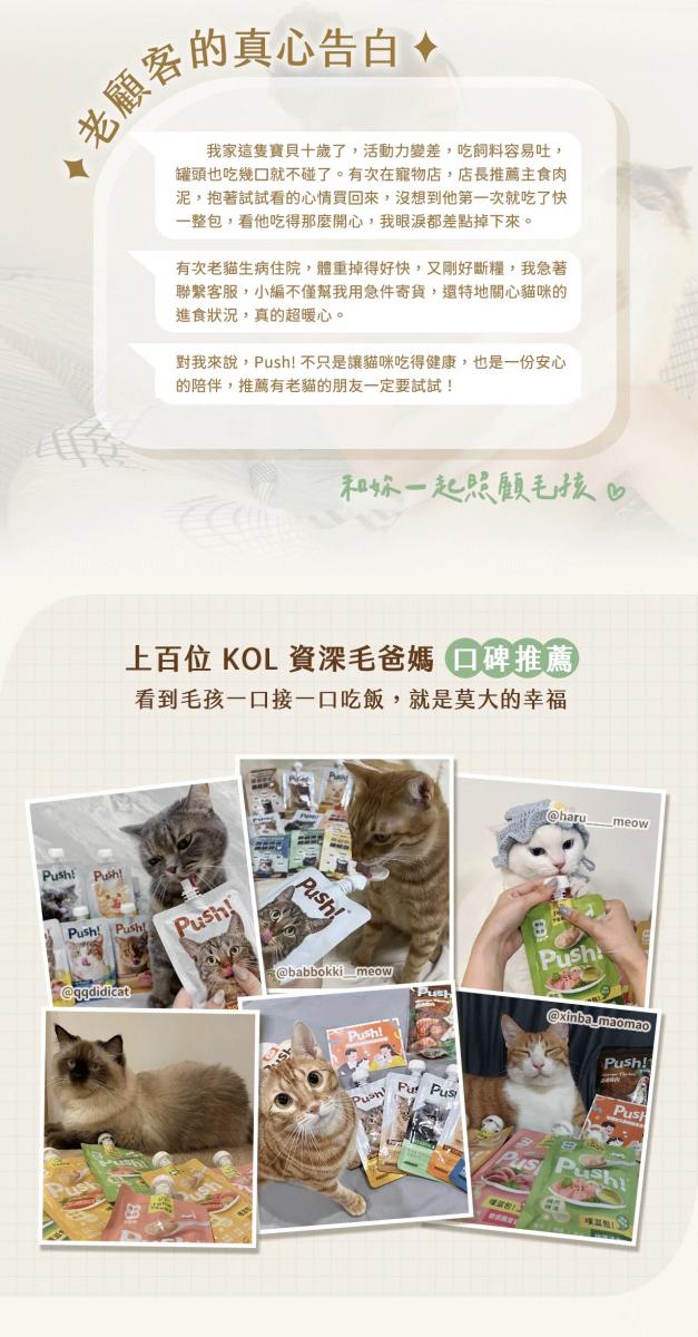 開始進食固態食物的離乳幼貓即可餵食 Push! 主食肉泥,其綿密適口的質地特別適合挑嘴或進食能力較弱的幼貓。此外,牙口不佳的高齡貓(銀髮貓)也能輕鬆食用。對於腎臟疾病的貓咪,由於需注意蛋白質與鈣磷比例,建議根據獸醫師提供的專業意見進一步調整餵食方案。